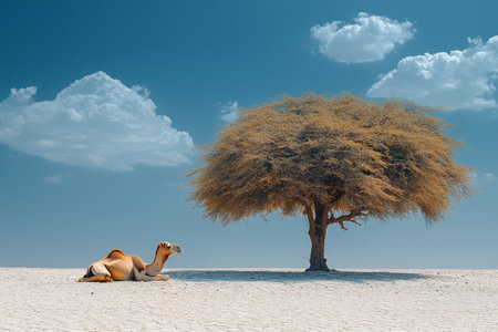 Camel resting under desert tree, sunny sky. Travel, nature poster