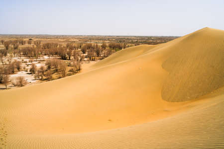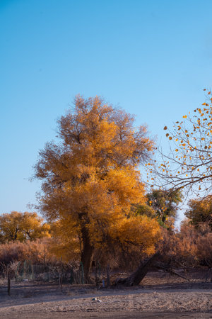 Populus euphrateca trees with yellow leaves in the autumn,in Ejina,Inner Mongolia, China. Nature background.