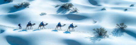 Aerial View Of Camel Caravan With Tourists In The Desert. Travel, Tourism, And Adventure Concept.