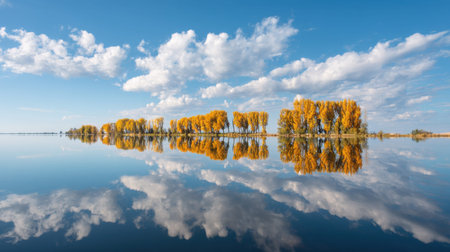 A stunning autumn scene showcasing trees with golden leaves reflected perfectly on calm water under a bright blue sky filled with fluffy clouds.