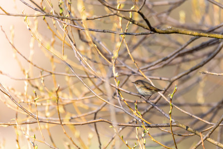 Phylloscopus trochilus. Willow Warbler among the branches in spring in the Arctic zone of Siberia