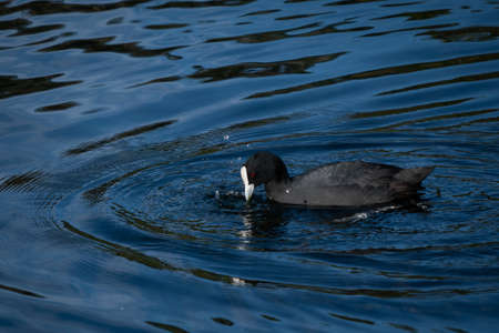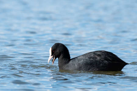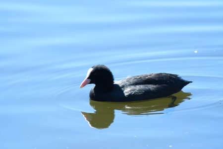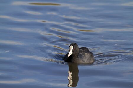 Swimming Eurasian coot in reflecting blue water, controlling breeding territory in lake Hornborga, Sweden.