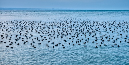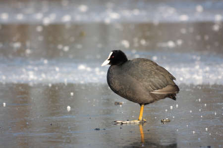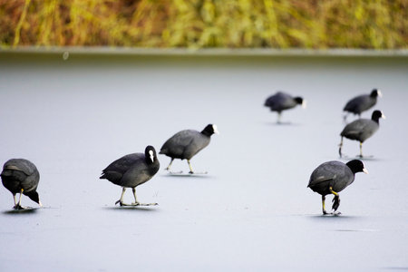 A flock of black waterfowl (Fulica atra) walking on the surface of a frozen ice lake in winter