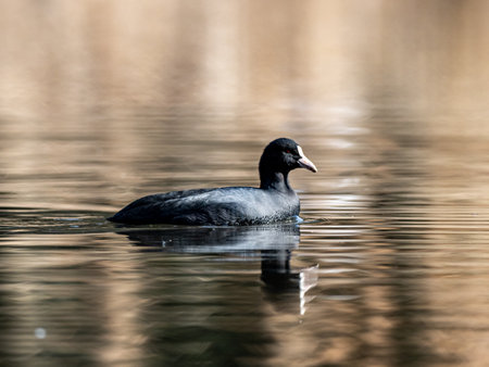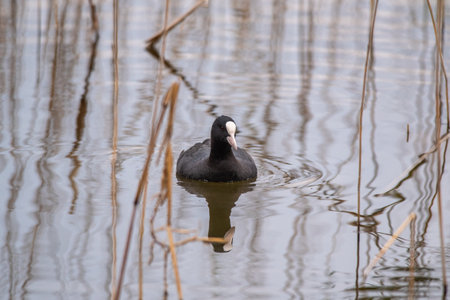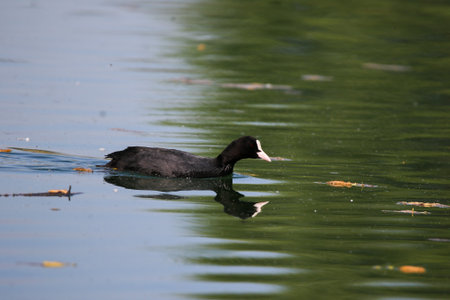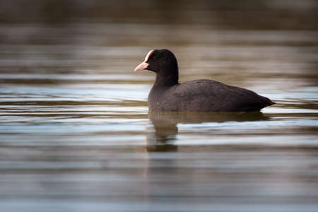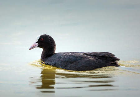 Coot (Fulica atra), a black water bird, swims in the calm water of the pond.