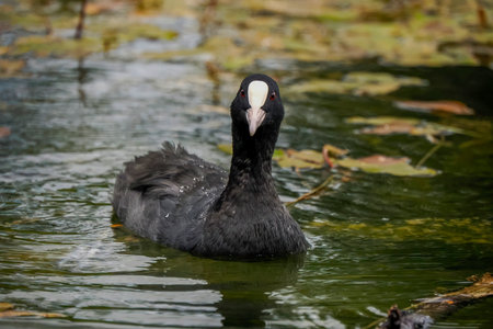 Eurasian coot swimming on calm green lake, surrounded by vegetation near Regensburg springtime