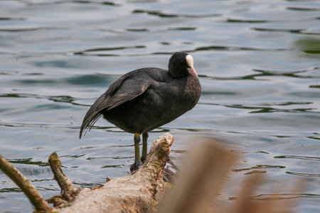Eurasian coot perched quietly on tree trunk by lake surrounded by green vegetation springtime