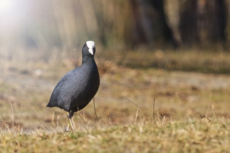 coot standing on the lawn with sunny hotspot,spring, migratory birds, birds, forest, lake, mood