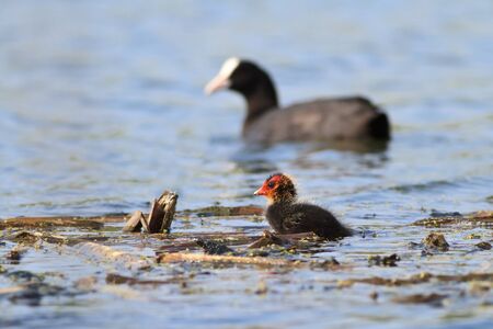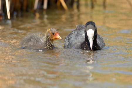 Eurasian or common coot, fulicula atra, duck and duckling on the waterlake