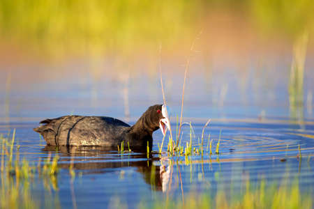 water bird Eurasian coot, Fulica atra on pond. Czech Republic, Europe Wildlife