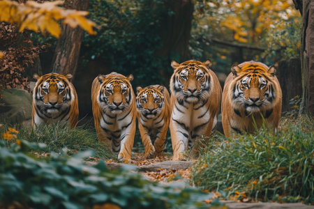 Five tigers are walking through a forest, highlighting the importance of wildlife conservation