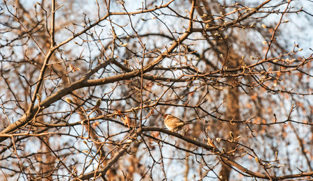Group of sparrows sitting on a branch of a poplar at the end of winter