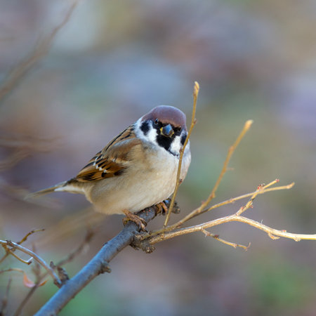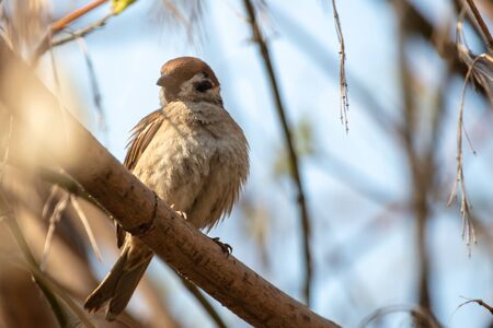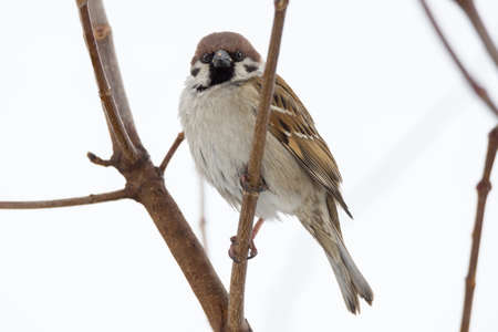 Songbird Tree Sparrow (Passer montanus) sitting on branch.