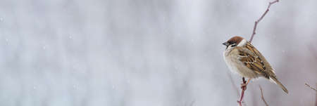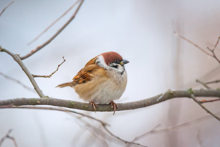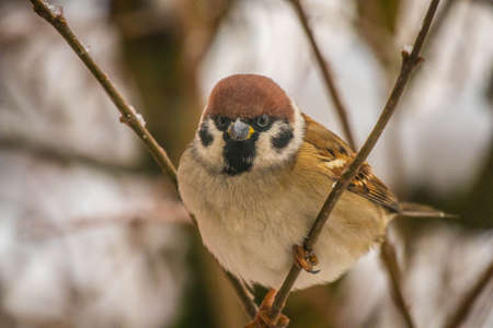 A eurasian tree sparrow on a branch in a winter forest
