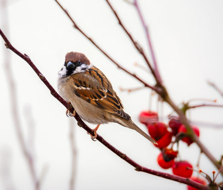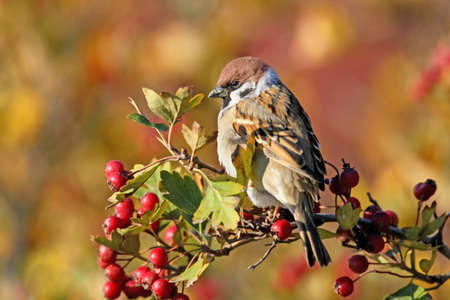 Close up photo of a tree sparrow sits on a branch of a hawthorn with berries