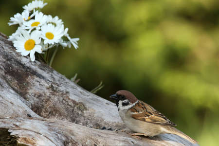 One Eurasian tree sparrow (Passer montanus) sitting and feeding on the brown branch. Green background with white flowers.