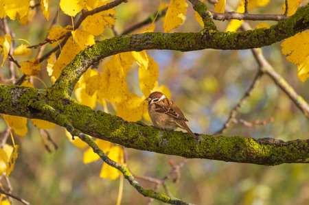 Sparrow on a branch of a tree in the autumn forest