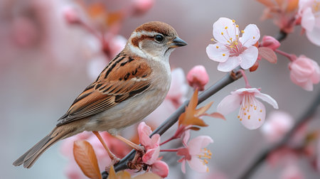 Sparrow on blooming bush branch