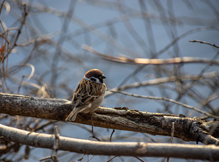 Sparrow on a tree branch against the blue sky.