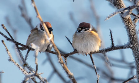 Sparrows on snowy tree branches in winter.
