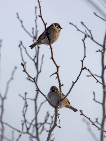 Small sparrows perch in a bare tree on a winter's afternoon near Yokohama, Japan.