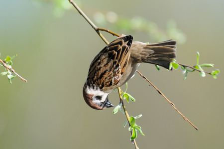 Eurasian tree sparrow Passer montanus hangs upside down at thin tree branch in spring. Moscow region, Russia