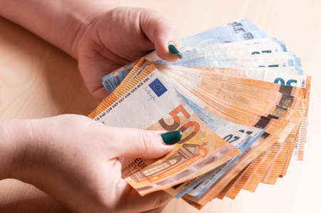 Fifty euro banknotes in womans hand, symbol of government help in quarantine time.