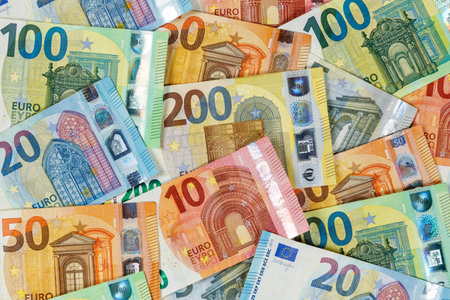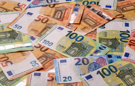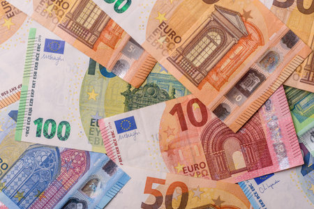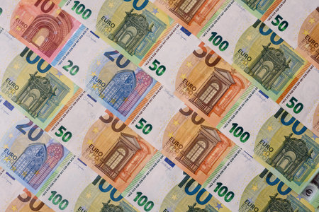 Many euro banknotes of 10, 20, 50, 100, and 200 denominations spread out as financial background, symbolizing wealth, economy, and European currency.