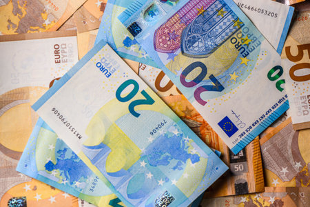 Close-up view of euro banknotes in 10, 20, and 50 denominations, detailed texture of European currency, symbolizing finance, savings, and economy...Keywords
