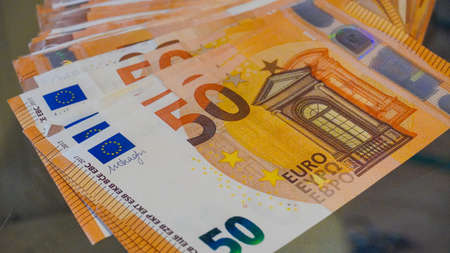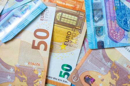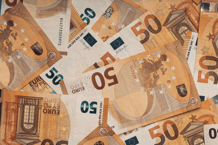 background of banknotes 50 euros beautifully laid out. euro money. European Union banking, financial savings. concept of economy. banks, money, wealth, finance and business success