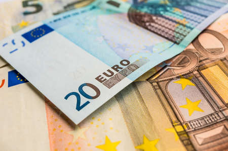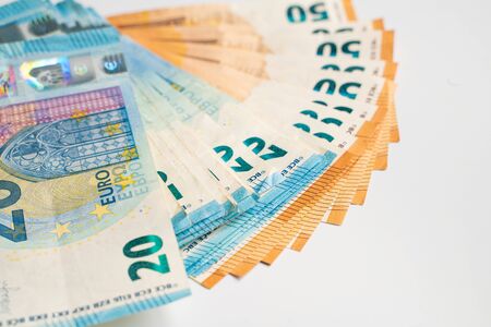 Selective focus on detail of euro banknotes. Close up macro detail of money banknotes, 20 euro isolated. World money concept, inflation and economy concept