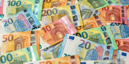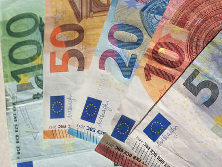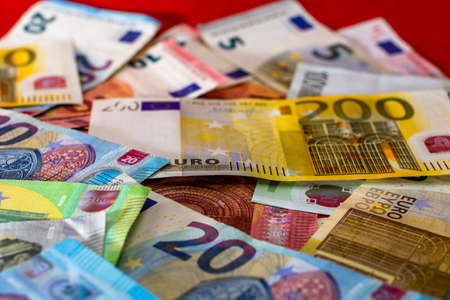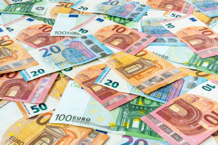 Many euro banknotes of 10, 20, 50, 100, and 200 denominations spread out as financial background, symbolizing wealth, economy, and European currency.