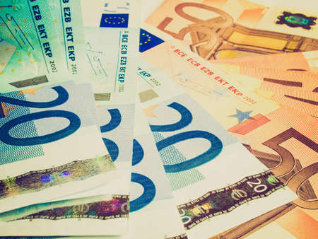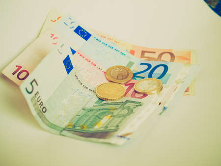 Euro money banknotes and coins - soft focus with vintage filter effect
