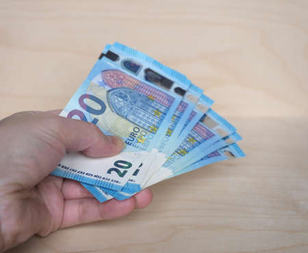 Hand holding showing euro money and giving or receiving money like tips, salary. 20 EURO banknotes EUR currency isolated. Concept of rich business people, saving or spending money.
