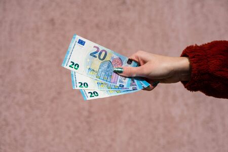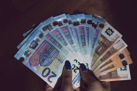 woman hands giving money like a bribe or tips. Holding EURO banknotes on a blurred background, EU currency