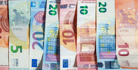 horizontal background of spread out paper euros of different denominations, Euro Money Banknotes
