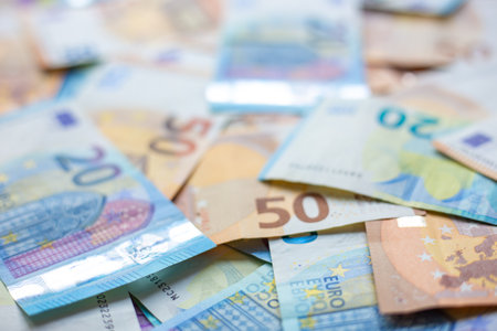 Close-up view of euro banknotes in 10, 20, and 50 denominations, detailed texture of European currency, symbolizing finance, savings, and economy...Keywords