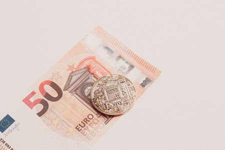 Money as background, euro coins and banknotes on white background. Money and financial concepts, banner, cover, mockup, for your design