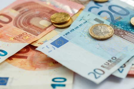 savings Cash money concept euro banknotes all sizes and cent coins on desk bill pay store text sum total save