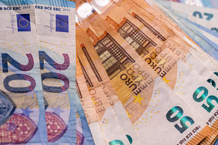Money background from 50 and 20 euro banknotes. Euro banknote close-up