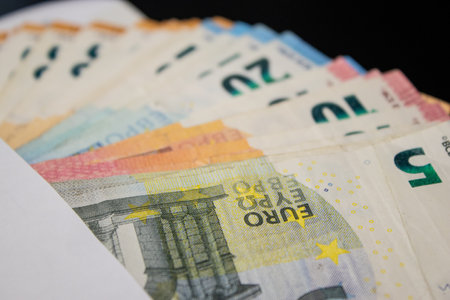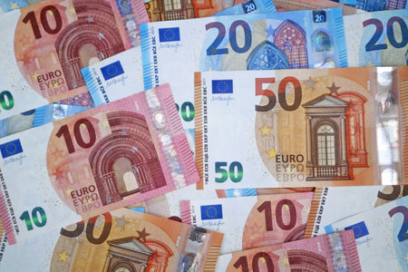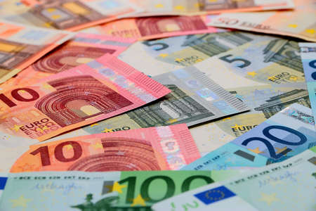 Many euro banknotes of 10, 20, 50, 100, and 200 denominations spread out as financial background, symbolizing wealth, economy, and European currency.