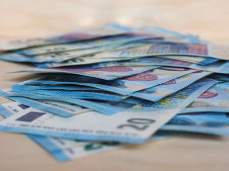 Euros bills of different values. Euro bill of twenty over others bills. Cash banknotes money background. Good earnings. Issuing the salary. Credit percent