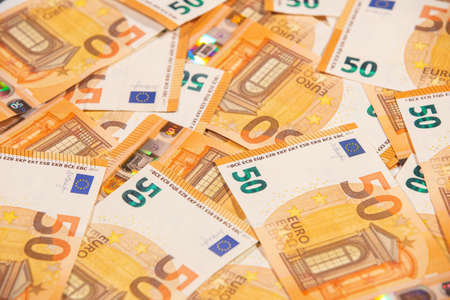 background of banknotes 50 euros beautifully laid out. euro money. European Union banking, financial savings. concept of economy. banks, money, wealth, finance and business success