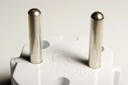 White plastic and metal pins power plug close up macro shot isolated on white.