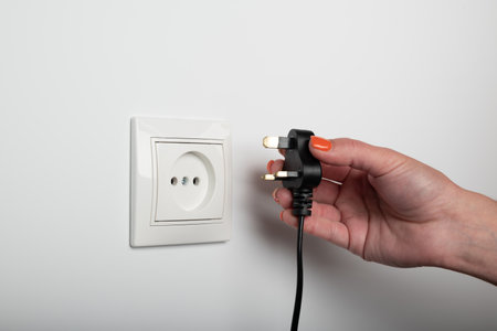 A hand is holding an electric plug. Energy concept