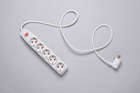 White electric extension cord with power button on gray background