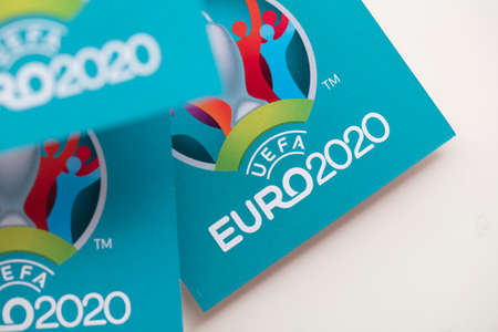 PARIS, FRANCE, JANUARY. 20. 2020: Logo of Euro 2020 football tournament, printed on white fabric