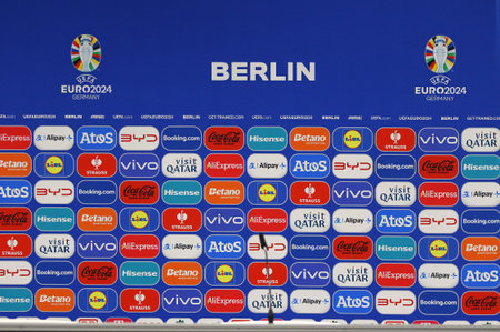 Berlin, Germany - June 7, 2024: UEFA EURO 2024 advertisement decoration signboard seen in Press Conference Room of Olympiastadion Berlin during Open Media Day in week before UEFA EURO 2024 Tournament