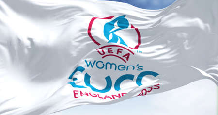 London, UK, May 2022: The flag of the UEFA European Women’s Football Championship Euro 2022 flying in the wind. Women’s Euro 2022 will take place in England from 6 to 31 July