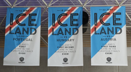 ICELAND - JULY 6, 2016: Iceland soccer team banner in the memory of Euro Cup 2016 games in Keflavik International Airport