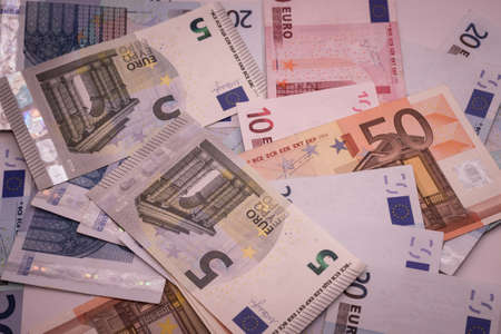 Euros bills of different values. Euro bill of twenty, fifty, one, two, five hundred. Cash banknotes money background. Good earnings. Issuing the salary. Credit percent